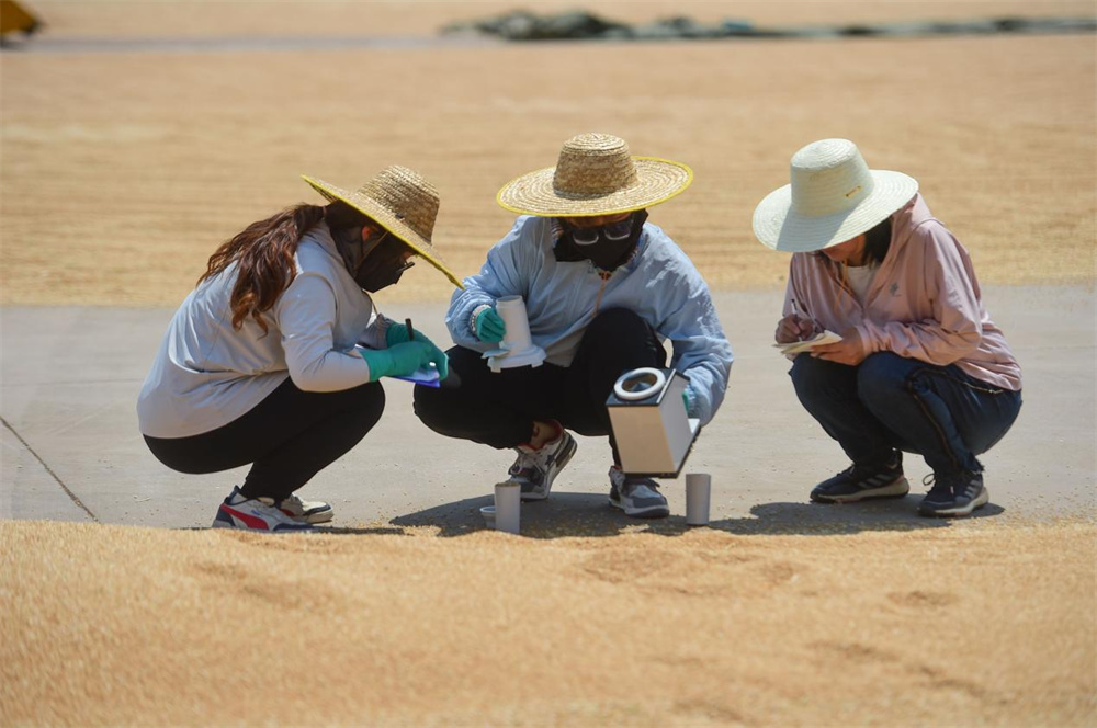 测产专家对黄骅市友和种植专业合作社种植的旱碱麦麦粒进行水分检测。傅新春 摄