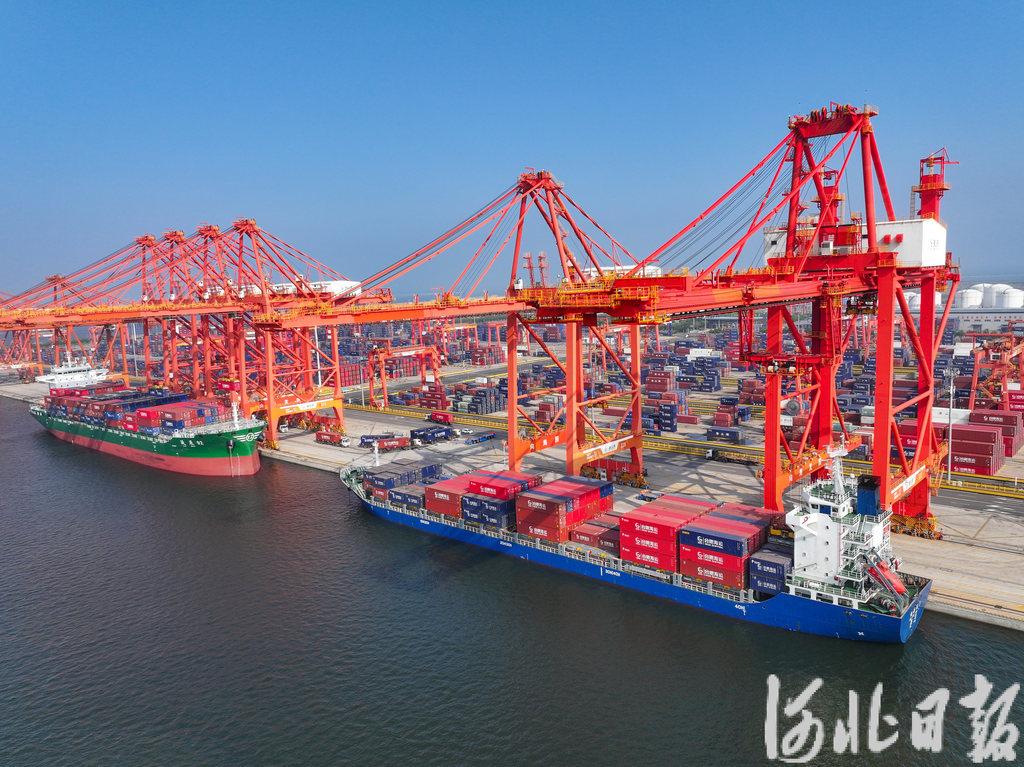 河北港口集团唐山港京唐港区集装箱码头,新一代穿越式双小车自动化岸桥正在进行作业。(河北日报资料片)