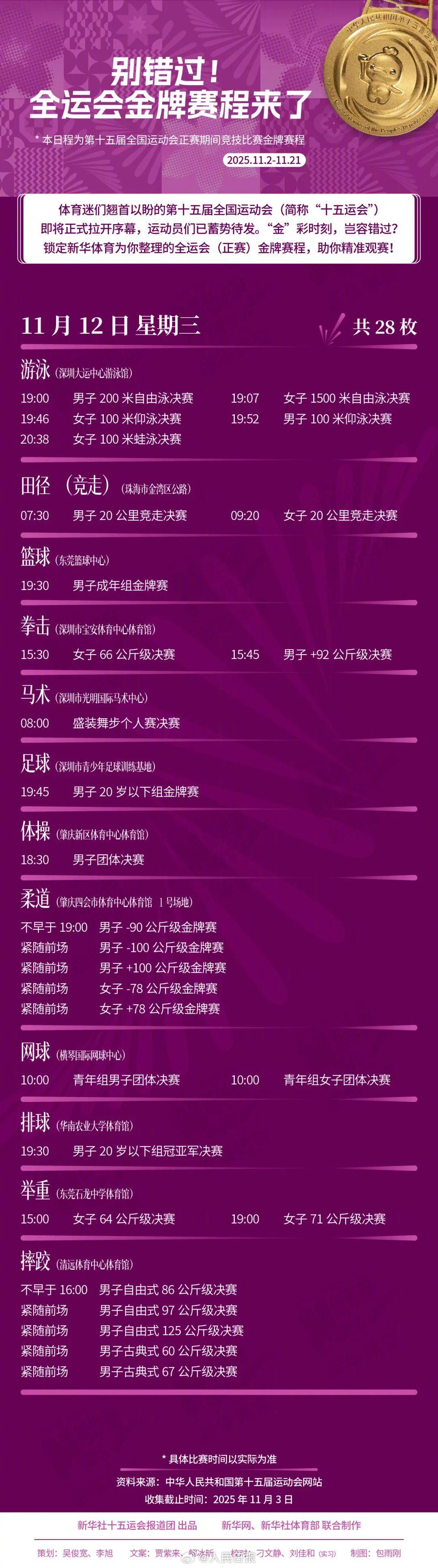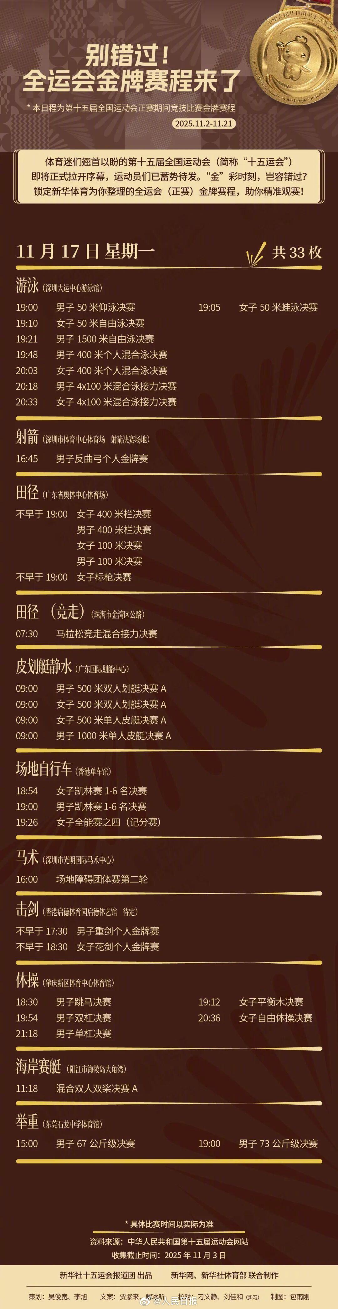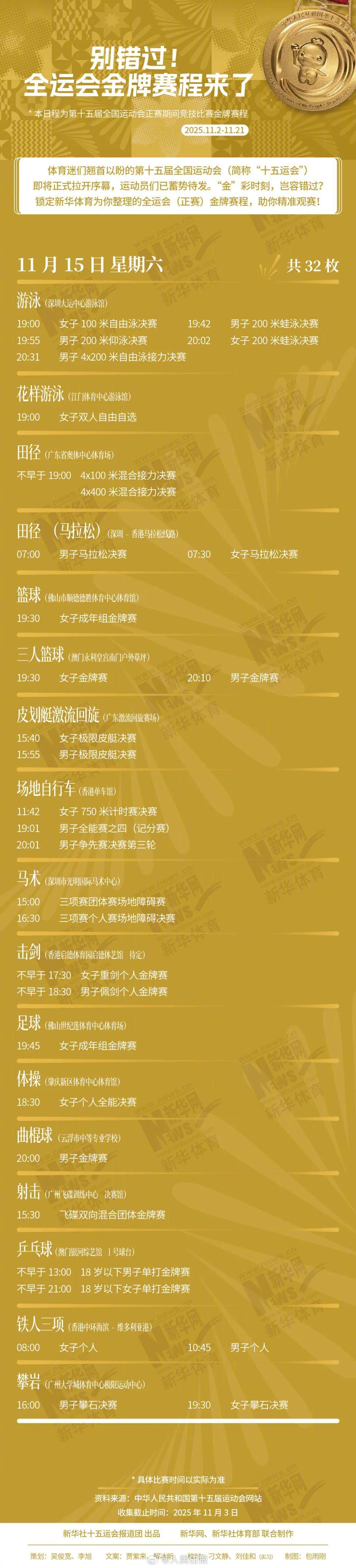 十五运会即将正式拉开序幕,运动员们已蓄势待发。别错过,快收藏这份全运会(正赛)金牌赛程!