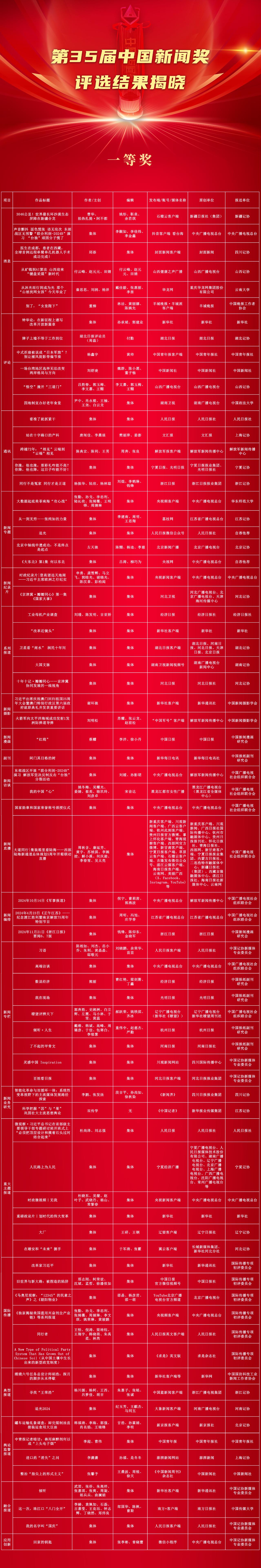 由中华全国新闻工作者协会主办的第35届中国新闻奖评选结果于11月5日揭晓。来自各级各类媒体的377件作品获中国新闻奖,其中,特别奖4件、一等奖74件、二等奖113件、三等奖186件。
