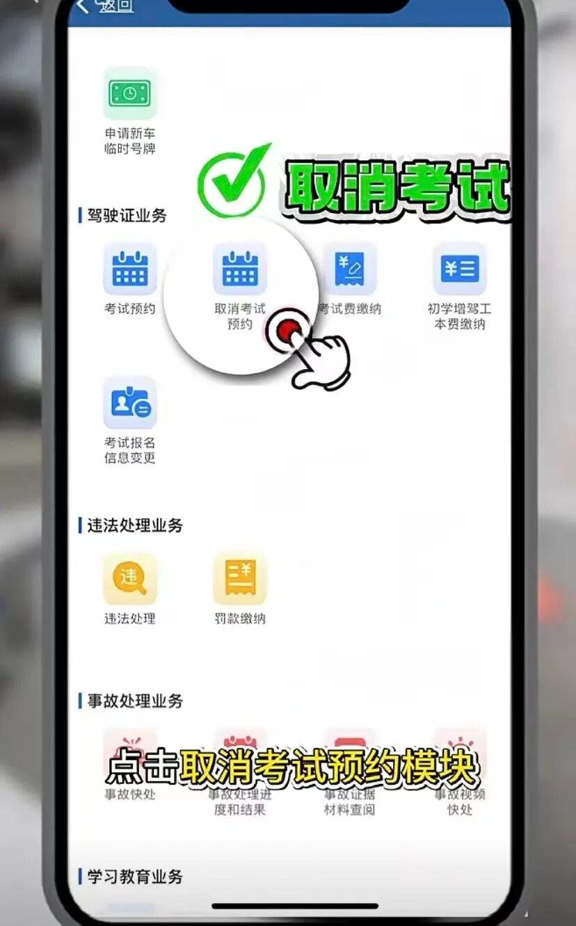 首页点击“更多”,在“驾驶证业务”中找到“取消考试预约”;