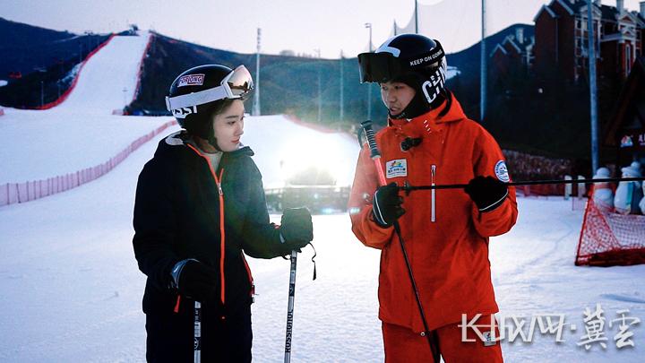 记者在富龙滑雪场向教练刘鹏扬(右)学习滑雪。长城网·冀云客户端记者 白亚军 摄
