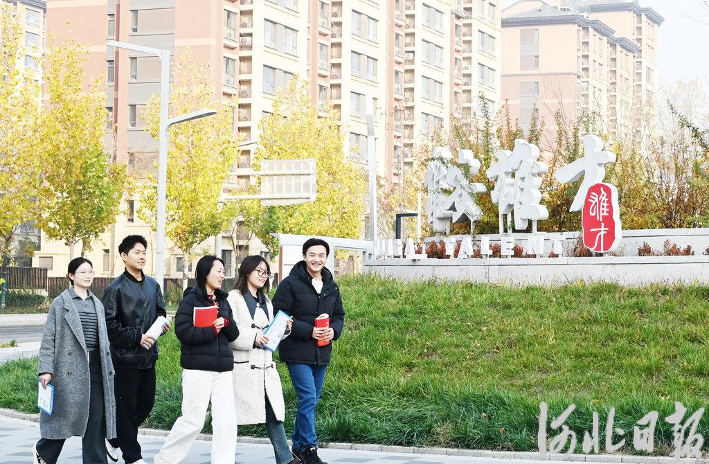 11月11日,雄安新区容东片区街头,一群年轻人搭伴儿前往雄才大厦咨询人才政策。河北日报记者 刘光昱 摄