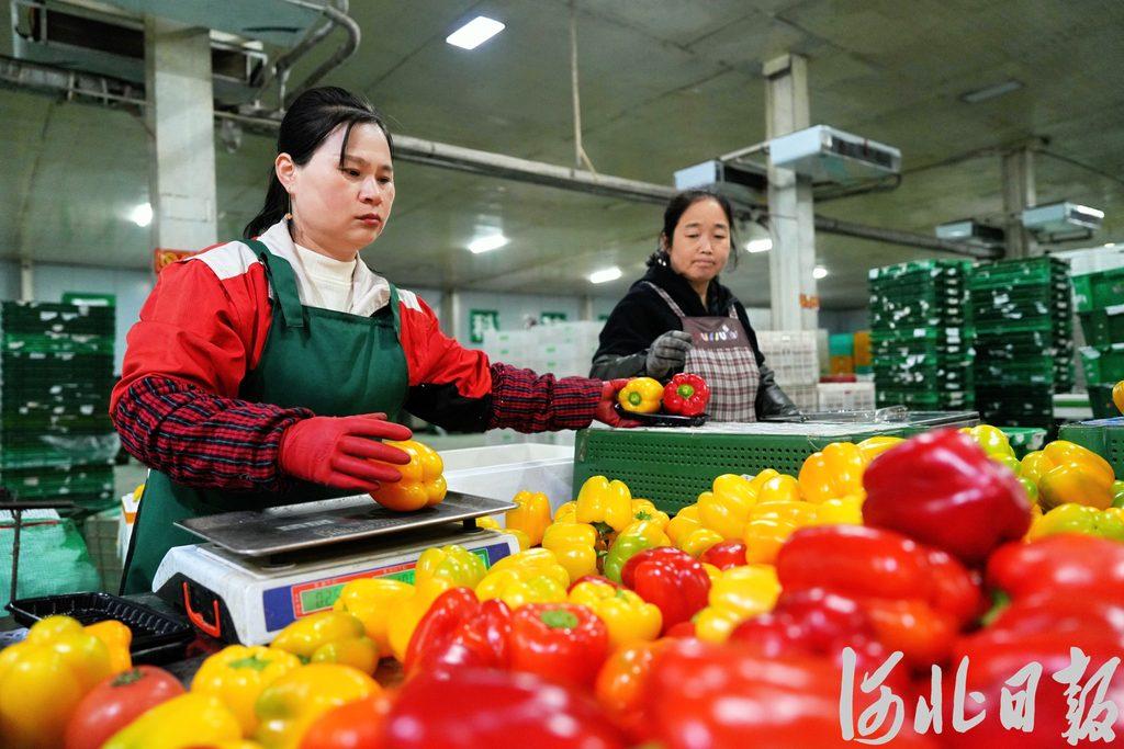 10月28日,在固安县顺斋瓜菜种植专业合作社的蔬菜加工车间,工人正在打包彩椒。河北日报记者 王伟 摄