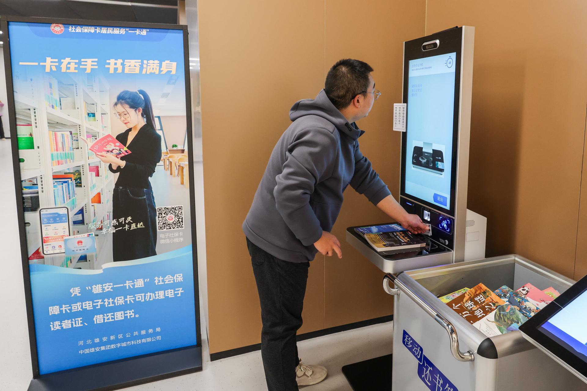 11月11日下午,记者来到新晋开馆的雄安图书馆。一楼大厅宽敞明亮,大屏幕上实时更新着累计进馆人数、借阅量等数据。在雄安新区工作的万先生手拿雄安一卡通在自助机上还书。万先生来自一家疏解企业,“新建的图书馆非常漂亮,适合在这里读书学习。”雄安一卡通应用范围广泛,不仅在雄安图书馆,在北京城市图书馆、首都图书馆都可以实现图书的借还。万先生就曾使用这张卡在北京城市图书馆成功借书,“北京城市副中心和雄安新区是北京‘新两翼’,作为一名雄安新区的建设者,能用雄安一卡通享受首都文化资源,非常方便。”