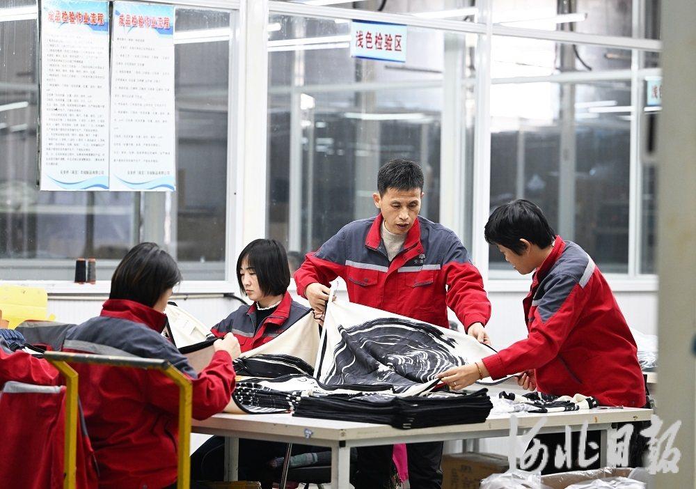 11月14日,安美桥(南宫)羊绒制品有限公司首席质量官赵建军(右二)在检查羊绒围巾质量。河北日报记者 赵永辉 摄