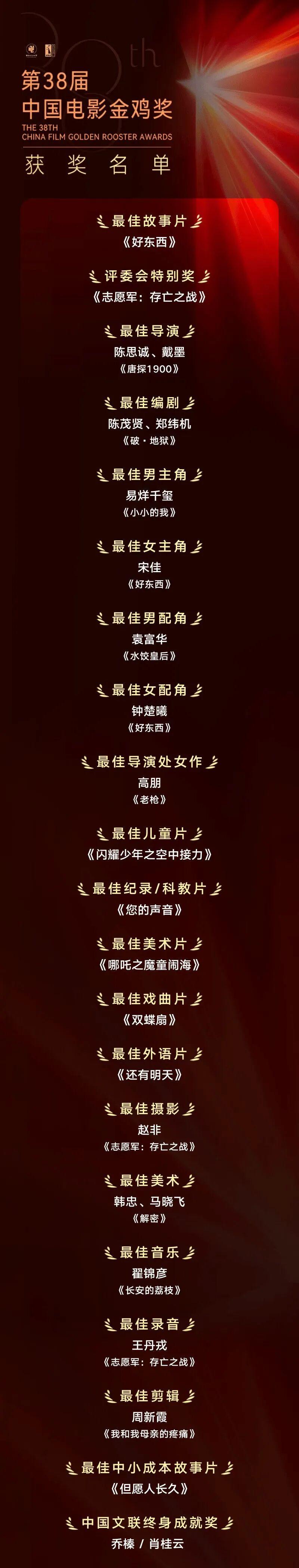 11月15日晚,第38届中国电影金鸡奖评选在福建厦门揭晓,我省摄制影片《闪耀少年之空中接力》荣获最佳儿童片奖,我省参与创拍影片《志愿军:存亡之战》荣获评委会特别奖、最佳摄影奖、最佳录音奖。