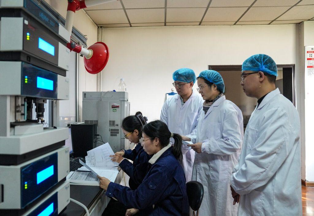 11月3日,在河北智同生物制药股份有限公司,科技特派团团长、中国药科大学教授梁艳(右二)在指导企业制定产品新的质量标准。河北日报记者 许佳奇 摄