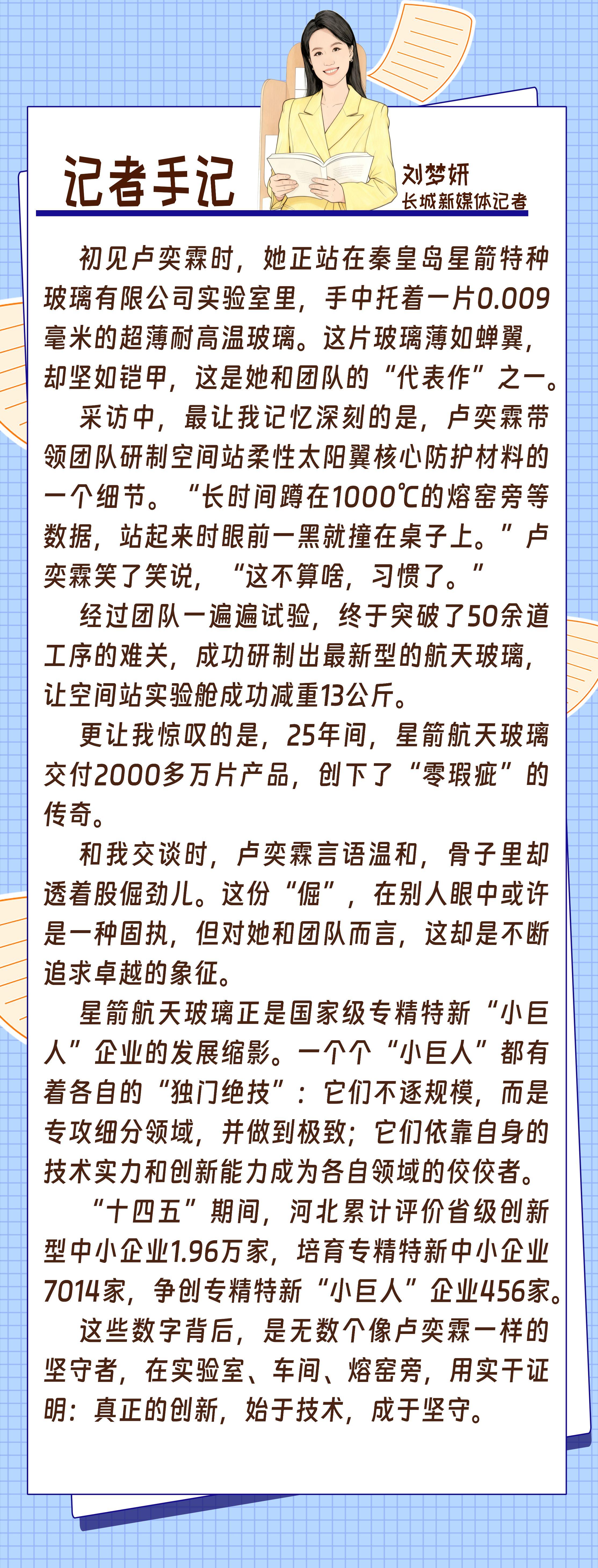 小玻璃有着“大身手”。在秦皇岛星箭特种玻璃有限公司生产车间,每一片看似平常的玻璃背后,都承载着不平凡的航天使命:自主研发的超薄柔性抗辐照玻璃盖片,让中国空间站“梦天”“问天”实验舱成功“瘦身”13公斤……这些突破,一次次刷新着中国航天玻璃的极限。