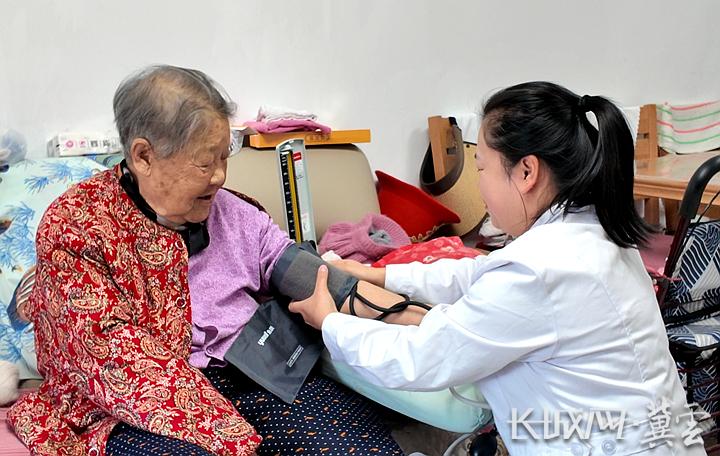 滨河社区护理人员上门为马桂富(左)检查身体。长城网·冀云客户端记者 王棋 摄