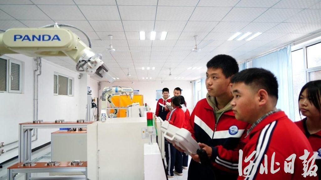 在河北临西县职教中心工业机器人实训室的综合实训台前,学生们正在操作完成机器人抓取、移动装配等实训任务。河北日报资料片