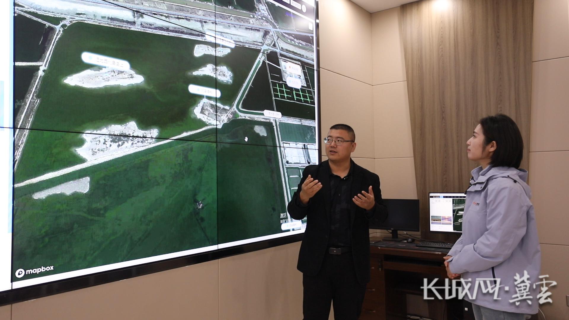 南大港产业园区文化旅游局宣传科科长张景兴向记者介绍“南大港湿地科研监测一体化平台”作用。长城网·冀云客户端记者 李全 摄