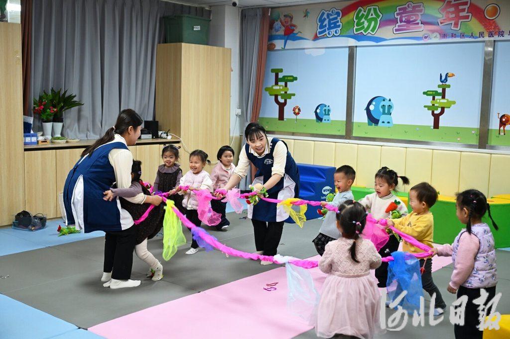 11月24日,邢台市南和区人民医院早托一体中心保育师带领孩子们做游戏。河北日报记者 赵永辉 摄