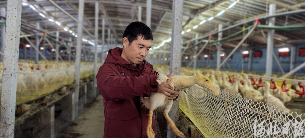11月18日,在献县河城街镇小屯村东北一处肉鸭养殖场,养殖户李龙旭正在查看鸭子生长情况。 河北日报记者 戴绍志 摄