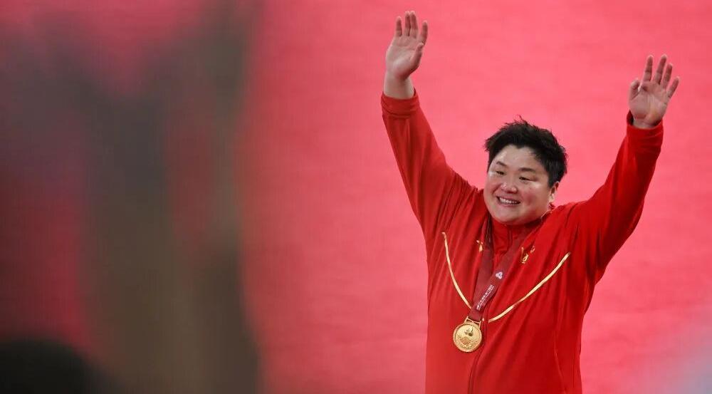 巩立姣实现了中国田径史无前例的全运五连冠,在颁奖仪式后向观众致意。