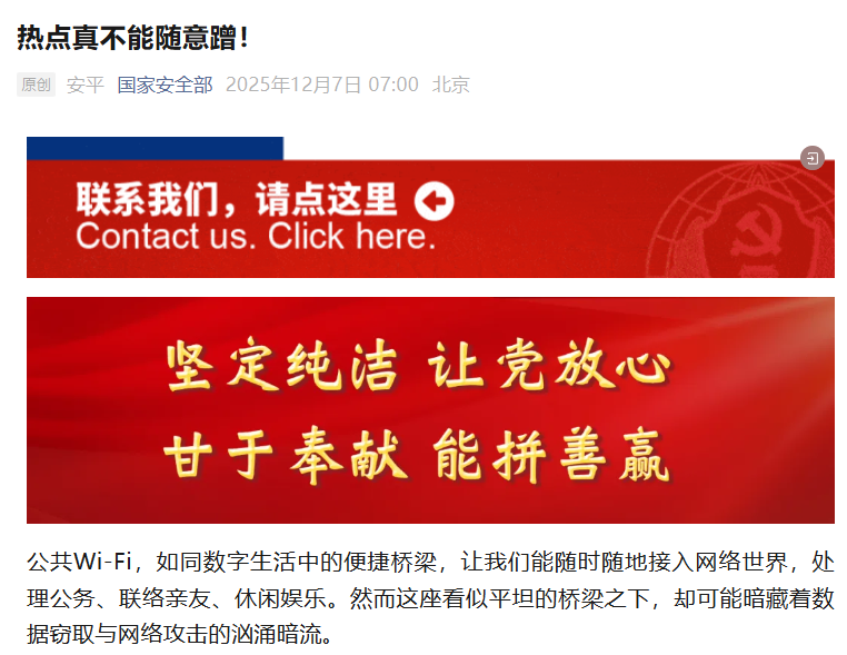 广大公民应自觉提升网络安全意识,不随意连接未知热点、不进行敏感操作、不点击可疑链接,筑牢个人防护屏障,净化网络空间环境,共同守护国家安全。如发现任何利用网络实施的间谍行为或可疑线索,请立即通过12339国家安全机关举报受理电话、网络举报平台(www.12339.gov.cn)、国家安全部微信公众号举报受理渠道或直接向当地国家安全机关进行举报。