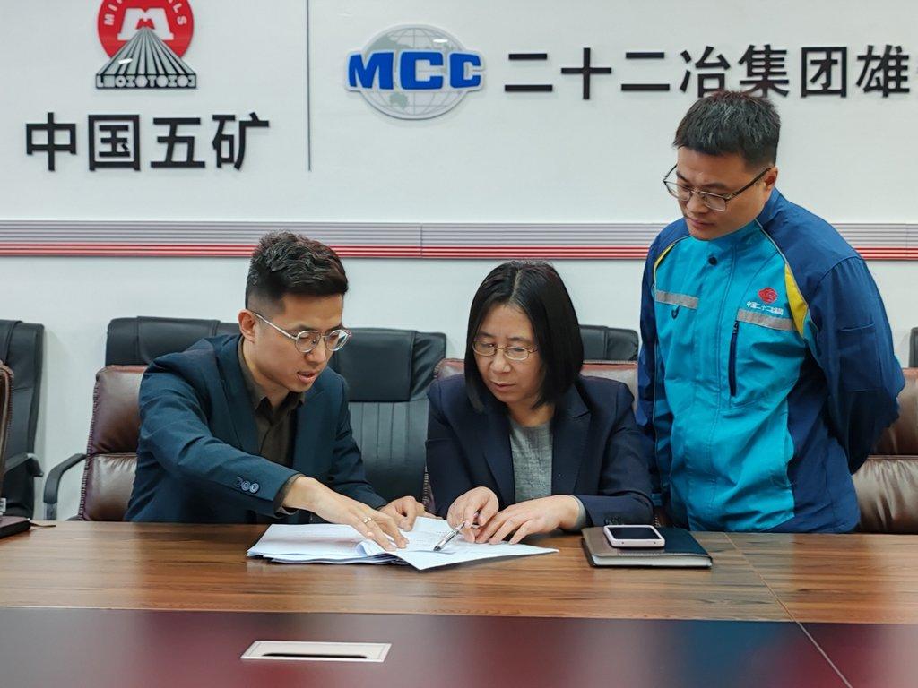 日前,崔文杰(左一)来到二十二冶集团雄安发展有限公司,与企业技术总监赵春梅(中)探讨企业与高校共建联合实验室方案。河北日报见习记者康晓博 摄