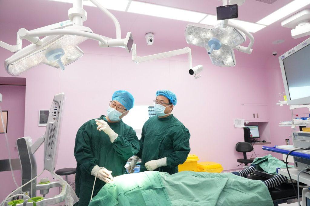 11月19日,郝津生(左)、聂雷(右)正在为患儿做手术。 北京儿童医院保定医院供图