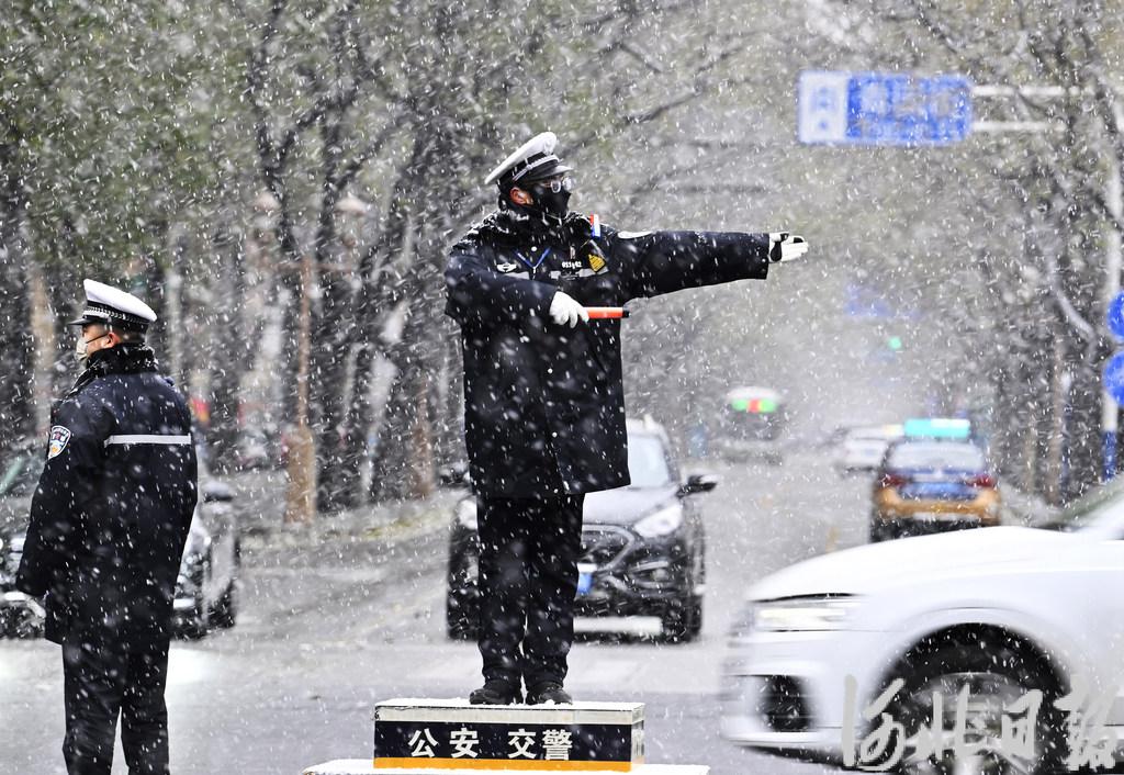 12月12日,在石家庄市裕华东路和青园街交叉口,交警冒雪疏导交通。河北日报记者 贾恒 摄