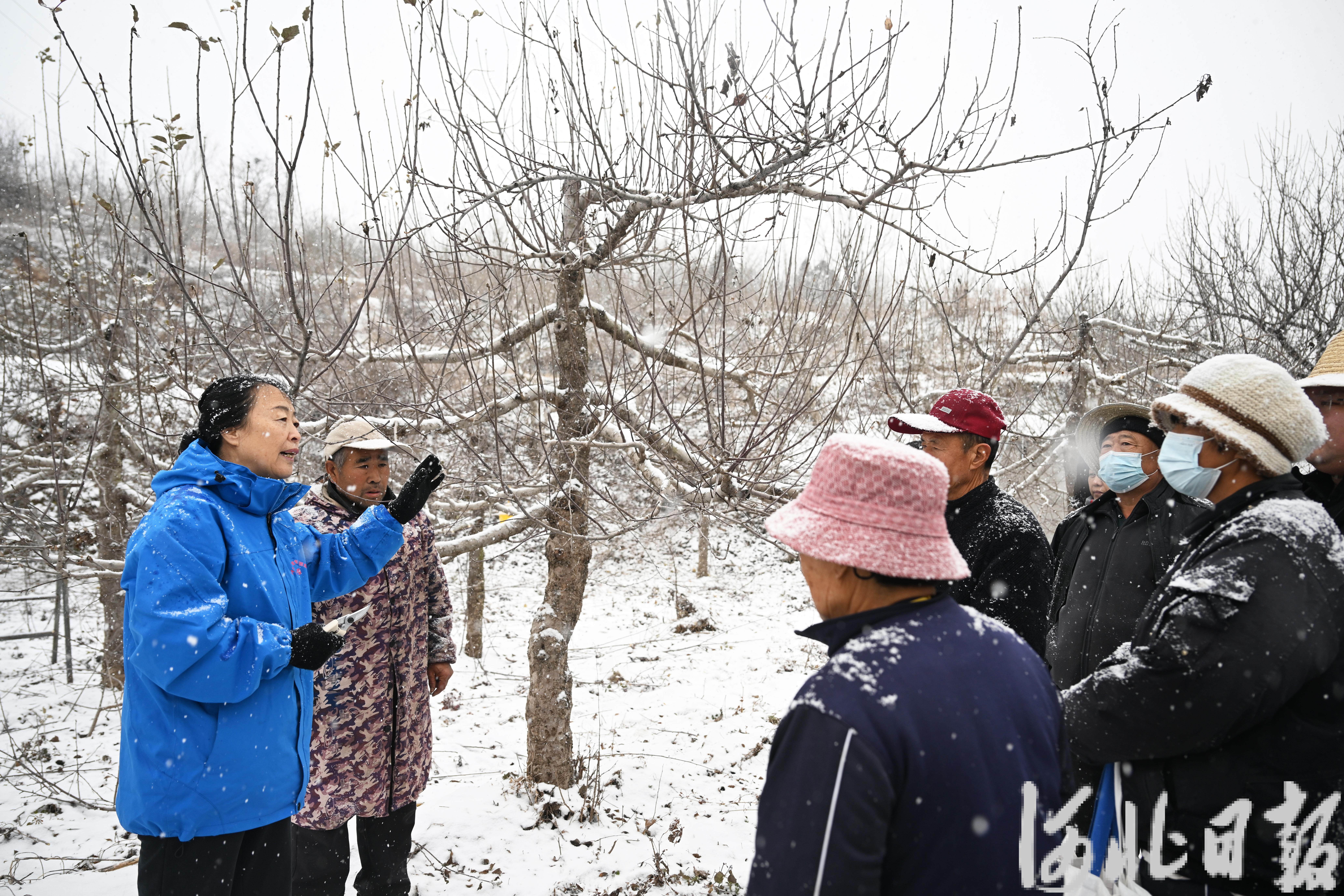 12月12日,李保国科技兴农专家团队队长、河北农业大学研究员郭素萍在临城县贾庄村为果农讲授苹果树冬季管理技术。河北日报记者 赵永辉 摄