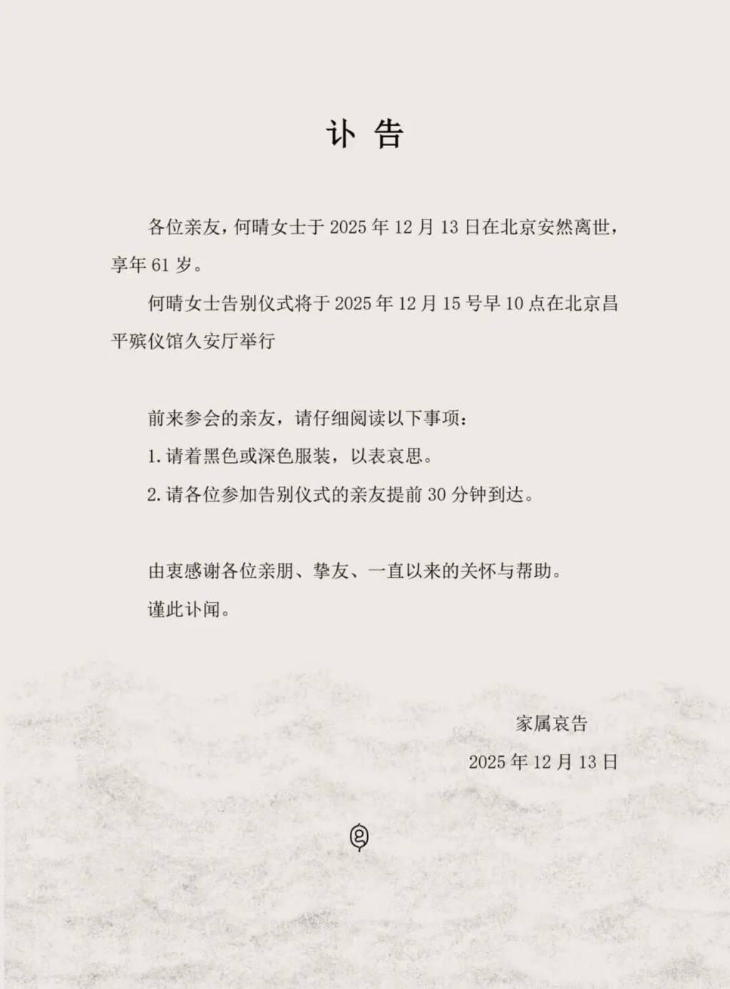 12月13日,一份家属发布讣告显示,著名演员何晴在北京安然离世,享年61岁。告别仪式将于2025年12月15号早10点在北京昌平殡仪馆久安厅举行。