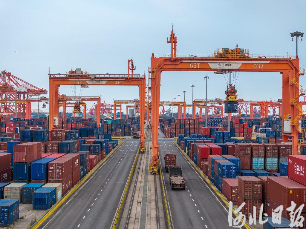 10月23日,在唐山港京唐港区集装箱码头堆场,集装箱运输车在装卸货物。 河北日报记者 赵杰 摄