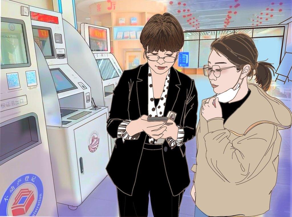 3月12日,王伟肖(左)在雄安新区南文营社区党群服务中心帮助居民通过手机操作打印证书。徐冲手绘图片