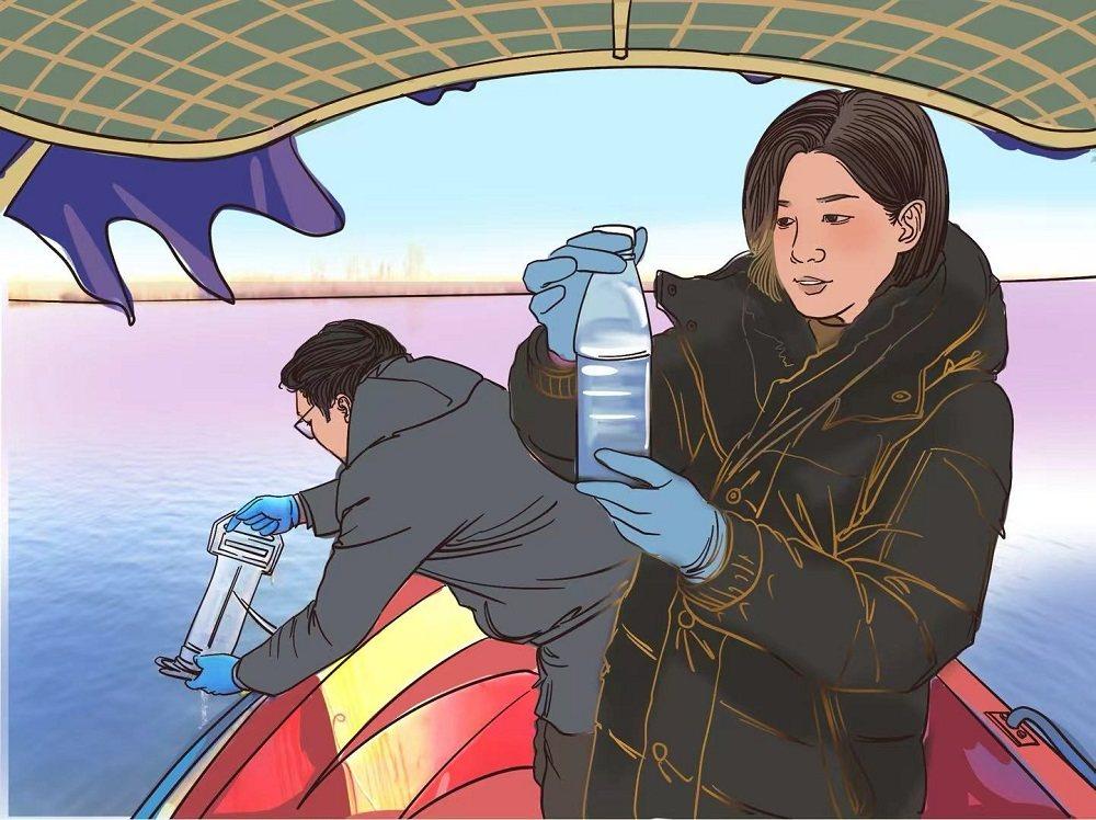 12月,刘冬梅(右)和同事在白洋淀上采集水样、检测水质。徐冲手绘