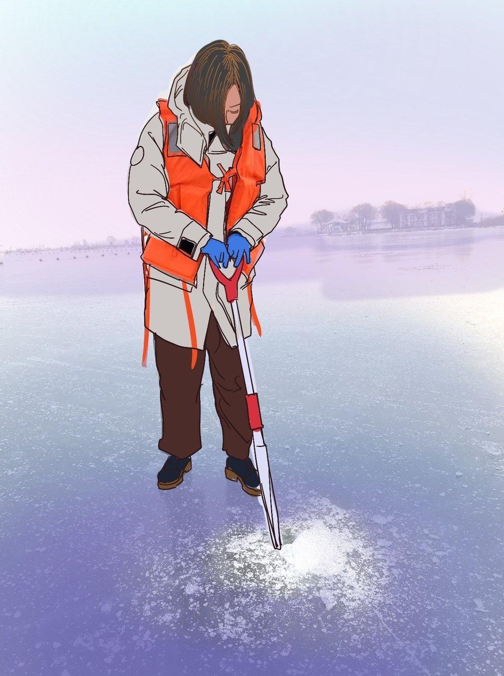 寒冬时节,刘冬梅在白洋淀上破冰采集水样、检测水质。 徐冲手绘图片