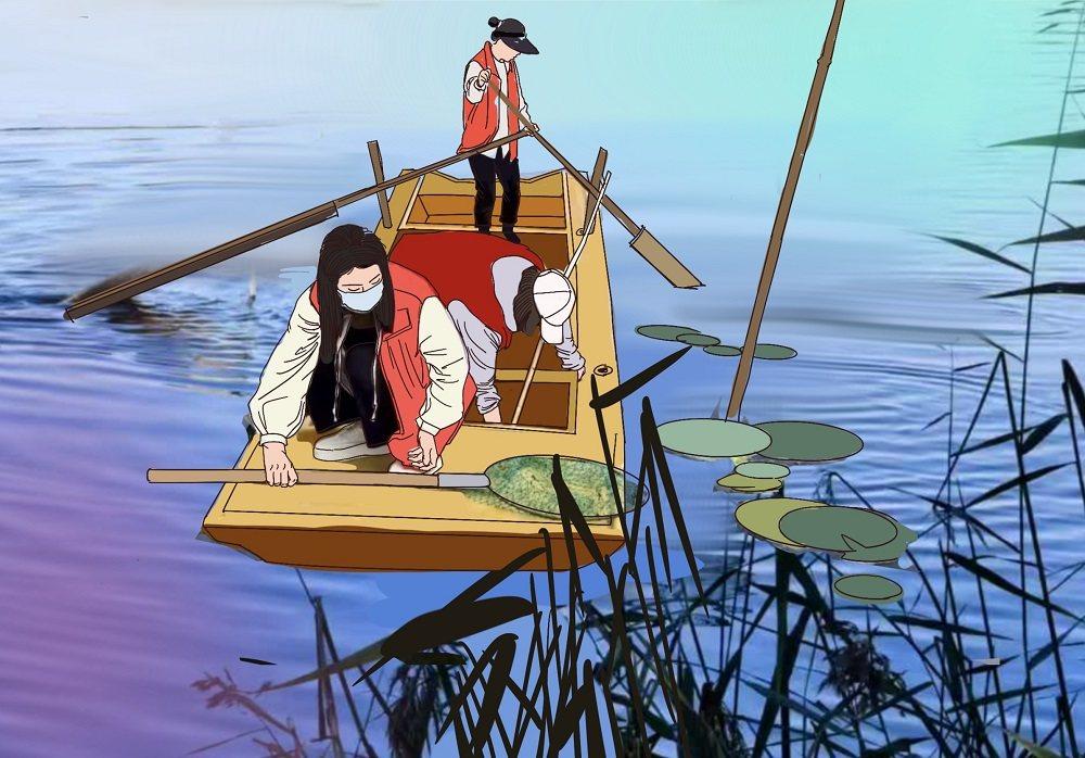 10月,安新县圈头乡“水生嫂”志愿服务队的队员们在白洋淀上清理垃圾,守护优美的环境。徐冲手绘