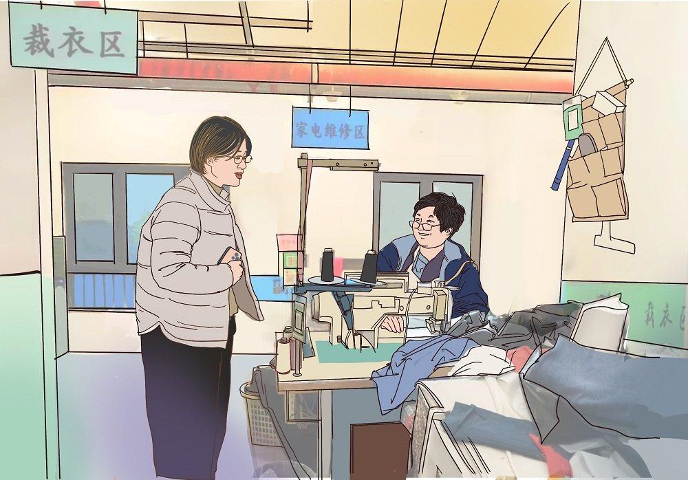 12月,王伟肖(左)在邻里驿站向工作人员了解最近经营情况,并帮助其解决遇到的问题。徐冲手绘