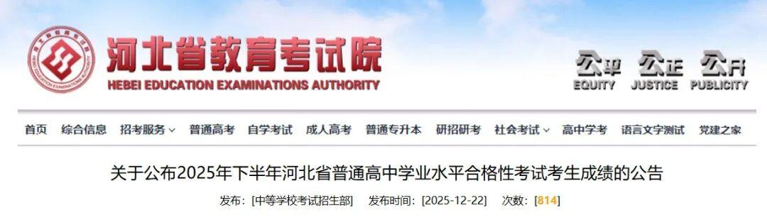 2025年下半年河北省普通高中学业水平合格性考试考生成绩将于2025年12月22日公布,现将有关事宜公告如下: