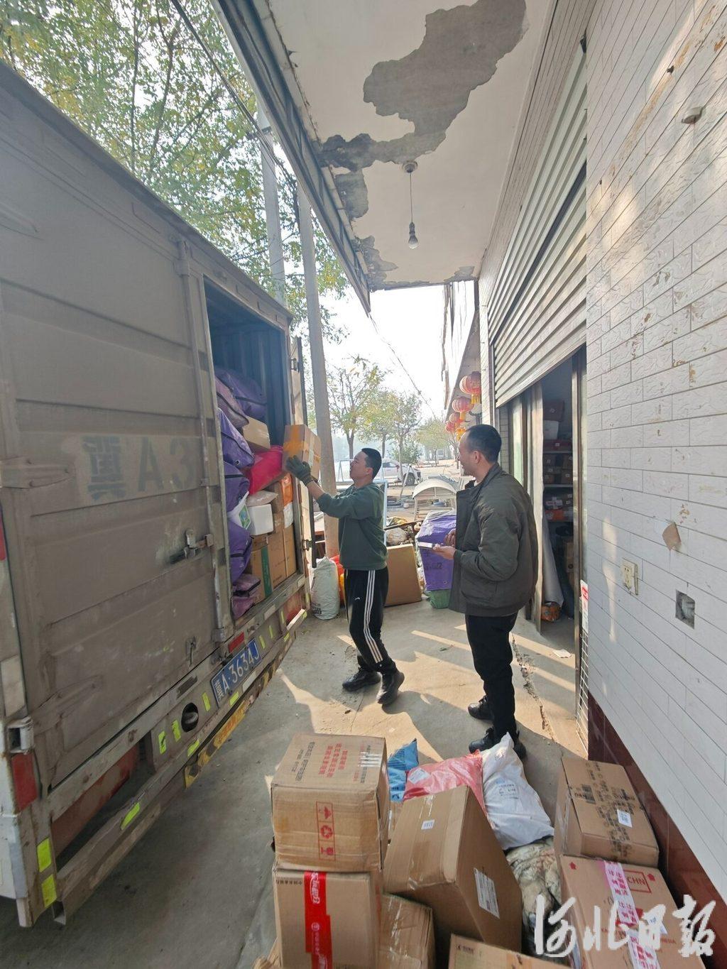 11月12日上午,无极县张段固镇东南丰村快递驿站门口,张满红(右)正在与快递运输车司机一起卸货。 河北日报记者 王思达 摄