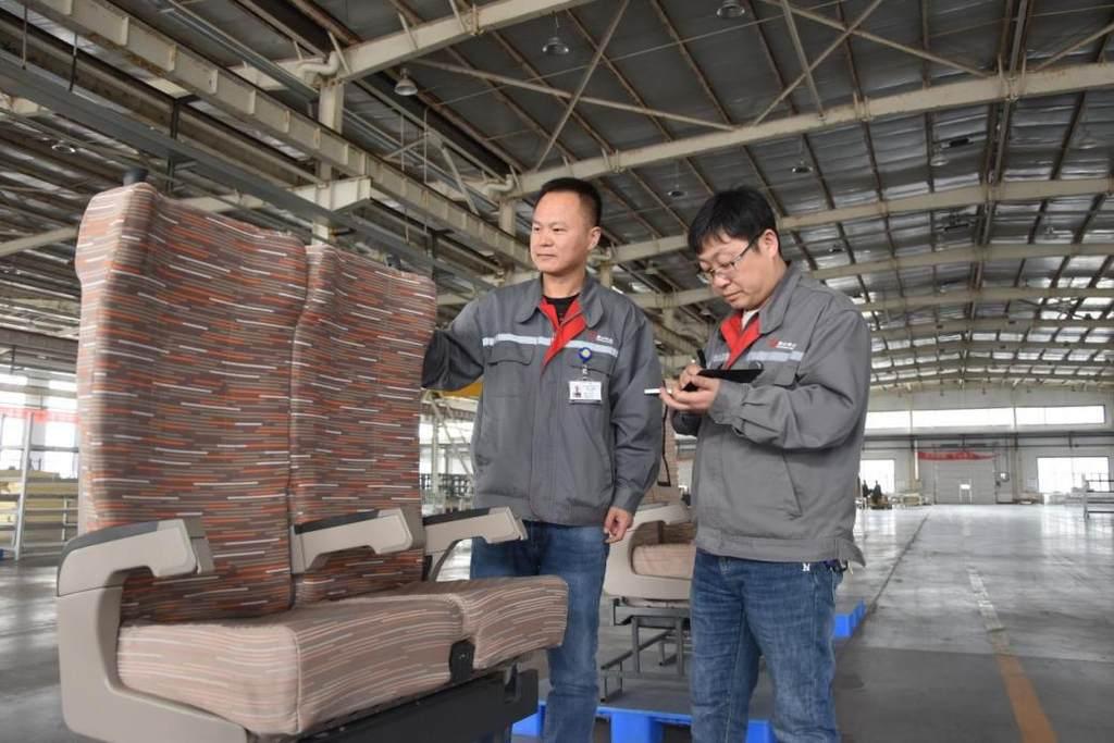2025年10月10日,唐山华达轨道交通装备有限责任公司的技术人员测试座椅。新华社发
