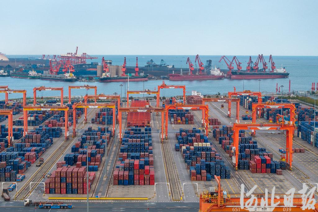 无人机拍摄的唐山港京唐港区集装箱码头堆场。 河北日报记者 赵杰 摄