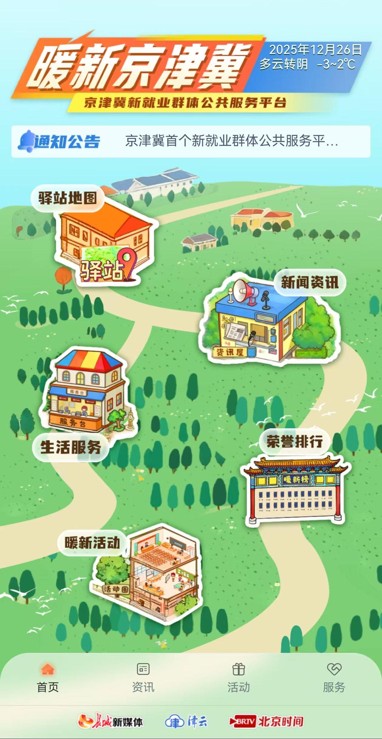 长城网·冀云客户端消息(记者 史叶)为了做好新就业群体的思想引导和凝聚服务工作,坚持网上网下结合,12月26日,长城新媒体集团、北京时间有限公司、津云新媒体集团联合策划推出的“暖新京津冀——京津冀新就业群体公共服务平台”正式上线,这也是京津冀首个跨区域、全链条的新就业群体智慧服务集成平台。