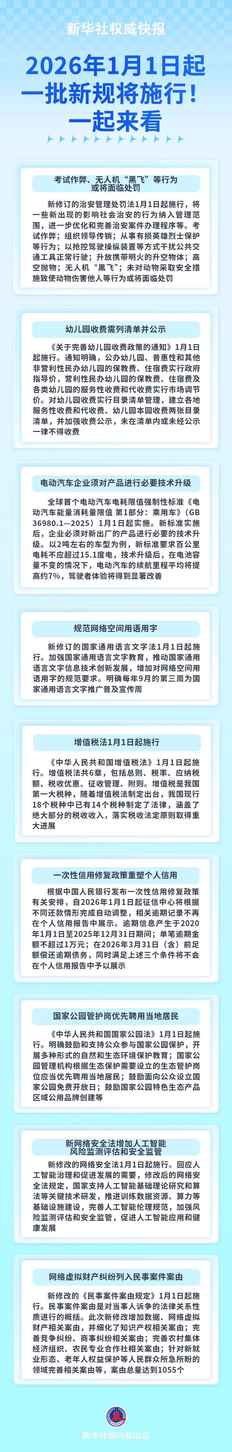 2026年1月1日起,一批新规将施行,事关社会治安、保育教育、电动汽车、网络安全等多方面,更好回应群众关切,护航美好生活,增添发展活力……一起来看,哪些你最关注?