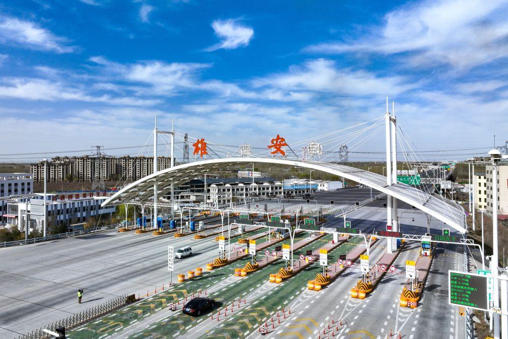 京雄高速雄安收费站(2025年3月25日摄,无人机照片)。2023年12月底京雄高速全线通车,北京五环到雄安只需1小时左右。