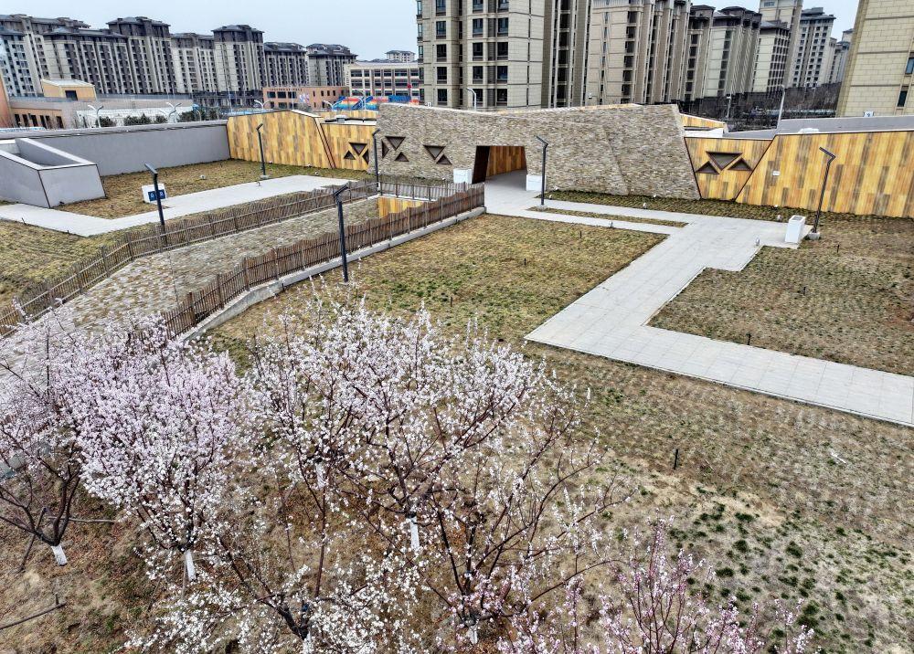 雄安新区容西片区“桃源梦境”主题变电站(2025年3月14日摄,无人机照片)。雄安新区的变电站大都化身主题公园融入城市景观,通过隐藏主变压器、降低设备噪音等设计,将“邻避设施”转化为“邻里景观”。蓝绿交织