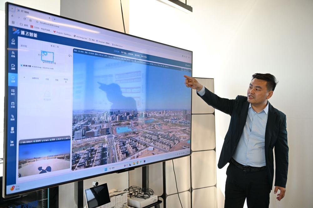 2025年3月19日,北京来源企业巡飞智能(雄安)科技有限公司总经理黄玉强在展示道路病害无人机自主巡检系统。