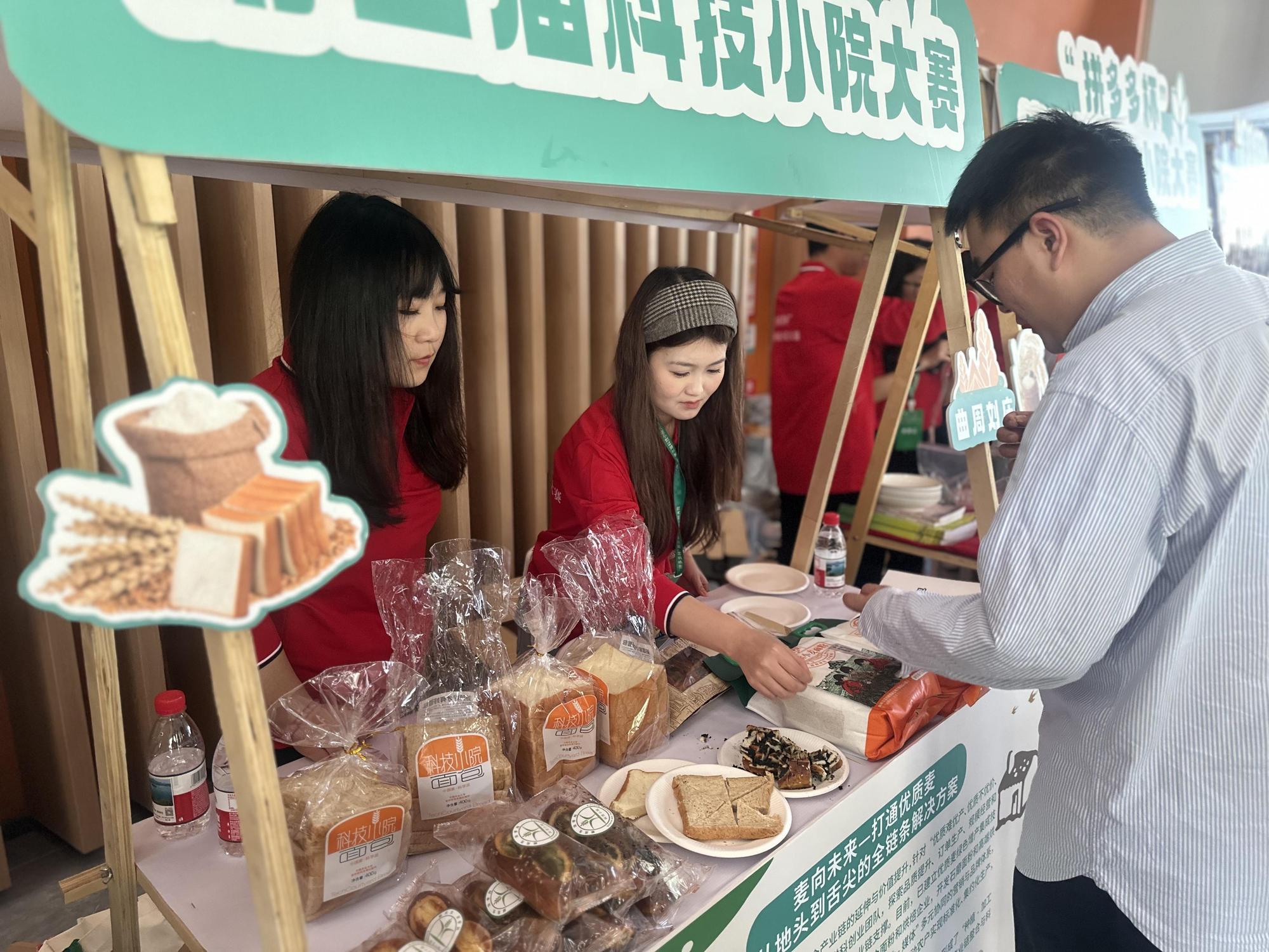 赛场外的产品展台,团队成员正在推介“科技小院面包”(记者韩雪莹 摄)
