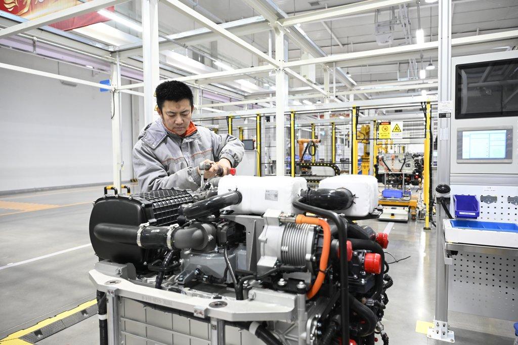 1月7日,在北京亿华通科技股份有限公司张家口生产基地,工人正在组装氢燃料电池发动机。河北日报记者 郭晓通 摄