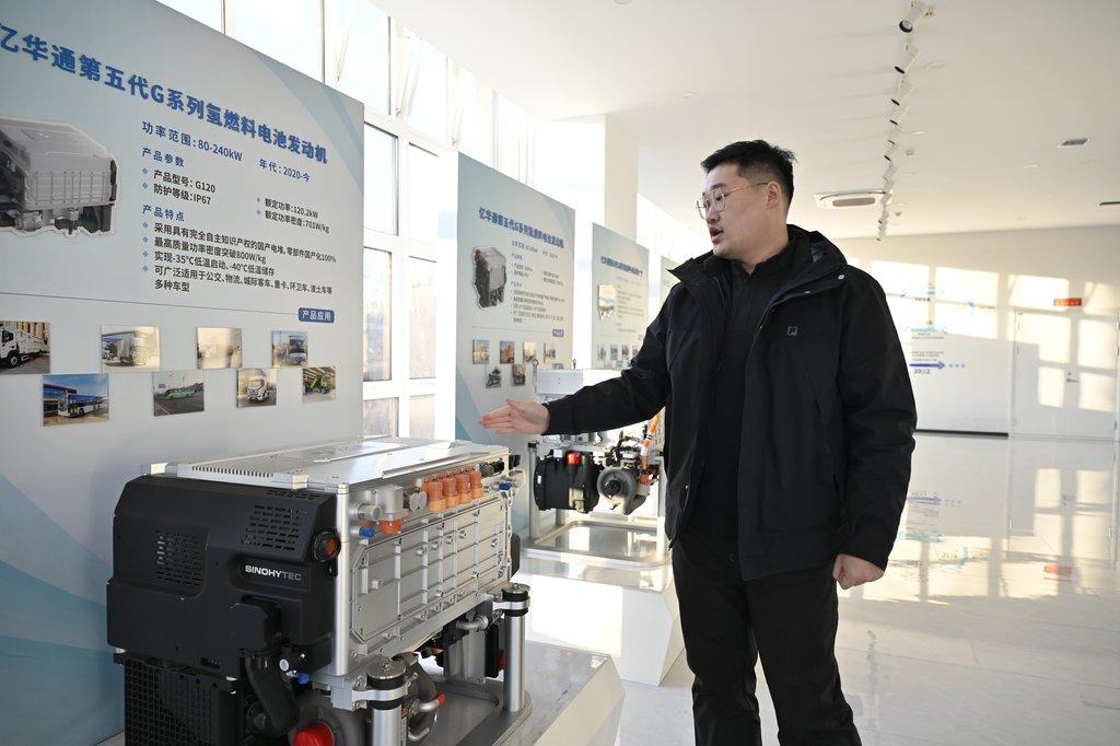 1月7日,在北京亿华通科技股份有限公司张家口生产基地的产品展厅内,工作人员向记者介绍氢燃料电池发动机样品。河北日报记者 郭晓通 摄
