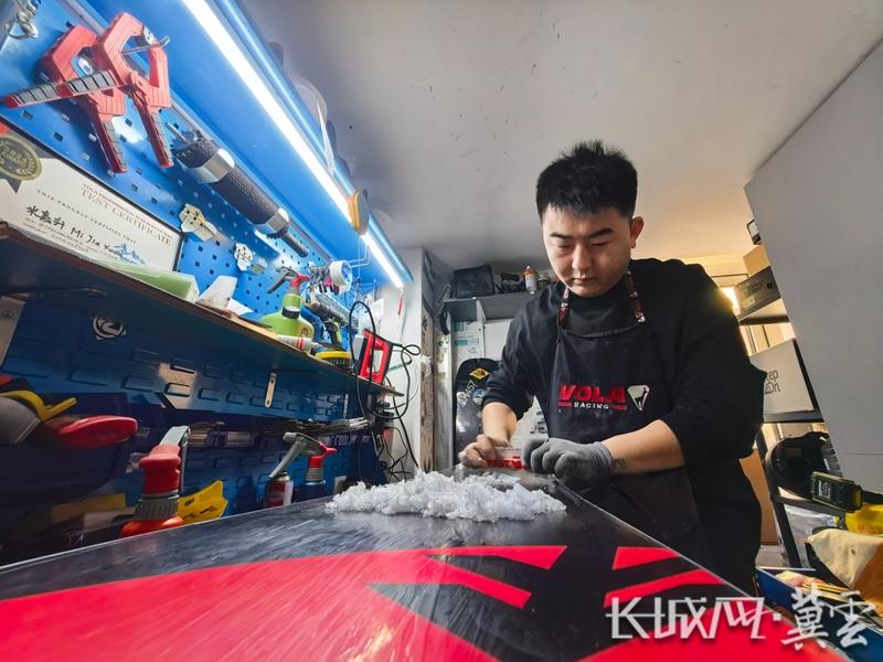 米嘉轩正在保养雪具。长城网·冀云客户端记者 熊睿琦 摄