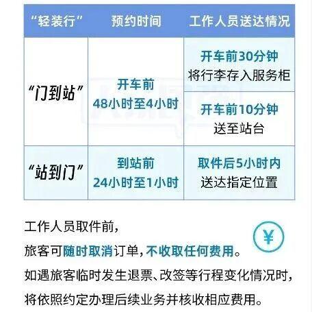 “轻装行”是铁路部门为旅客出行提供的“门到站”“站到门”同城行李搬运服务。在同城距离车站35公里内,旅客根据实际需要可选择以下两种“轻装行”服务: