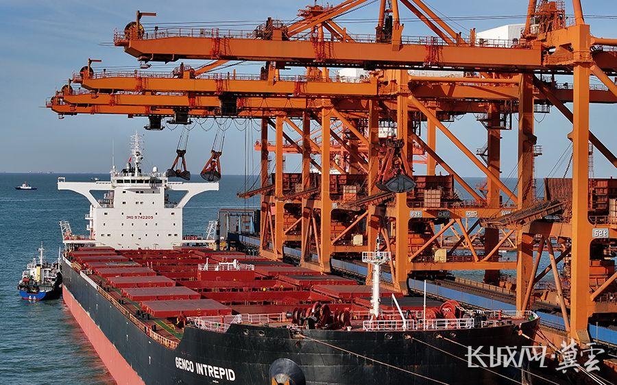 1月13日,靠泊在唐山港曹妃甸港区矿石码头的一艘轮船在卸载。新华社记者 杨世尧 摄