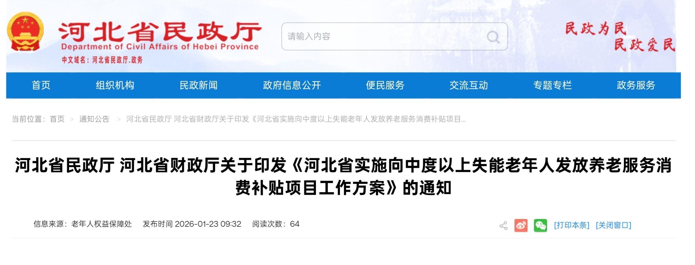 长城网·冀云客户端消息(记者 陈思思 王棋)记者1月23日从河北省民政厅获悉,自1月起,河北全面实施向中度以上失能老年人发放养老服务消费补贴项目。该项目将通过发放电子消费券,为中度及以上失能老年人购买居家、社区、机构养老服务提供补贴支持。