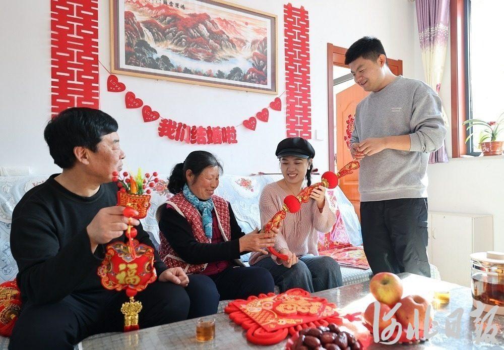 1月31日,吕晓哲(右一)、王亚(右二)为家里精心准备了年节饰品。河北日报记者 赵海江 摄