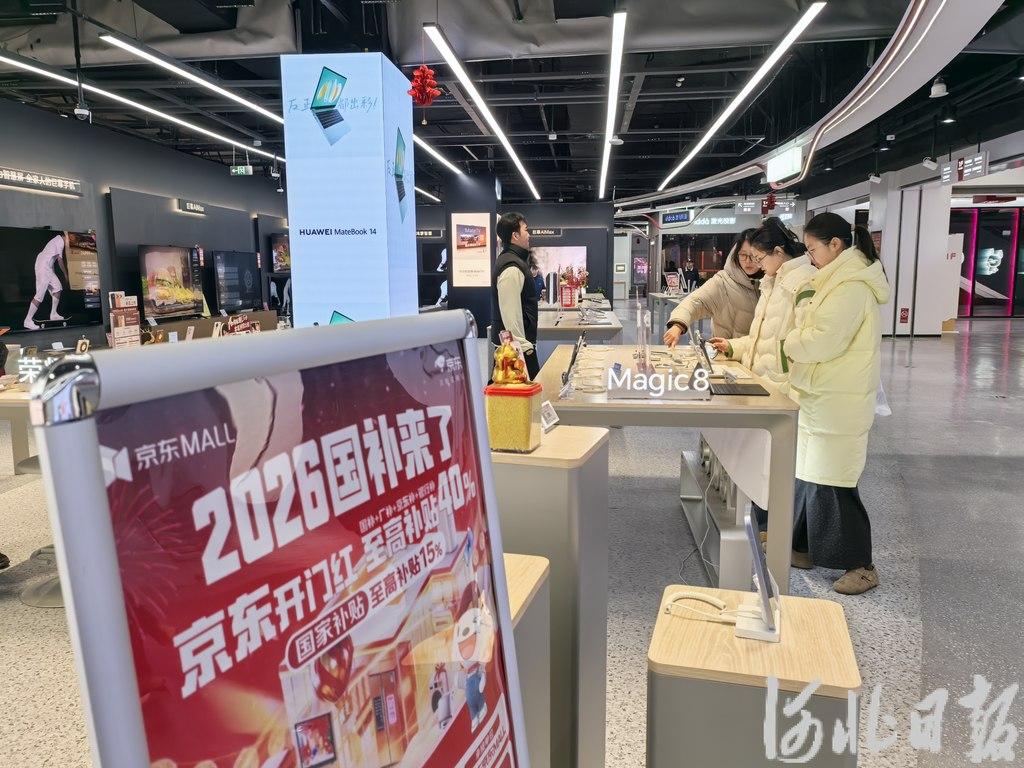 京东MALL石家庄新华店营销负责人介绍,在“国补”政策之外,卖场还同步推出了年货节直降活动。消费者若持旧手机换新,旧机残值还可额外提升20%。多重优惠叠加,数码和智能产品的销量增长非常明显。