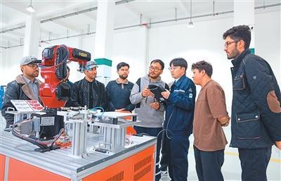 近年来,甘肃省金昌市依托甘肃有色冶金职业技术学院承办阿富汗专业技术人才培训项目。图为在该职业技术学院智能制造产教融合实训基地内,老师为阿富汗学员讲解工业机器人编程与运维操作流程。张宏斌 摄(人民视觉)